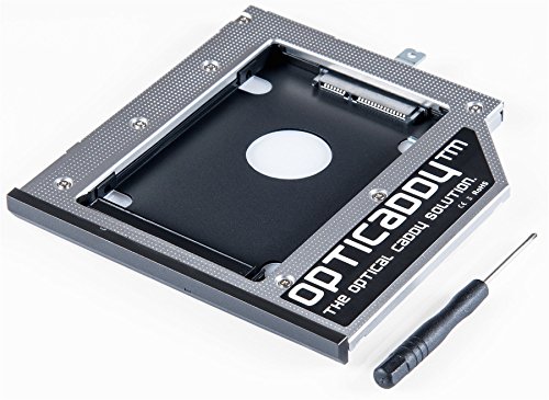 OptiCaddy est un robuste mais léger deuxième disque dur Caddy de la dernière génération en aluminium (importante dissipation de chaleur), avec composantes éléctroniques SATA-3 entièrement compatibles pour une vitesse maximale et vis intégrés pour une fixation sûre de votre disque dur ou SSD. Il dispose d'un cadre de plastique à l'intérieur qui aide à réduire les vibrations de votre second disque dur.